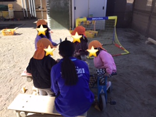 園庭に出ると鬼ごっこを始めていたり、おままごと遊びをしていました。 おままごとでは、職場体験のお姉さんと一緒にホームパーティーをしていました。