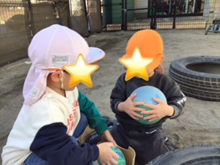 マットとタイヤで坂道を作り、ボールを転がして、ケラケラと笑って遊んでいました。