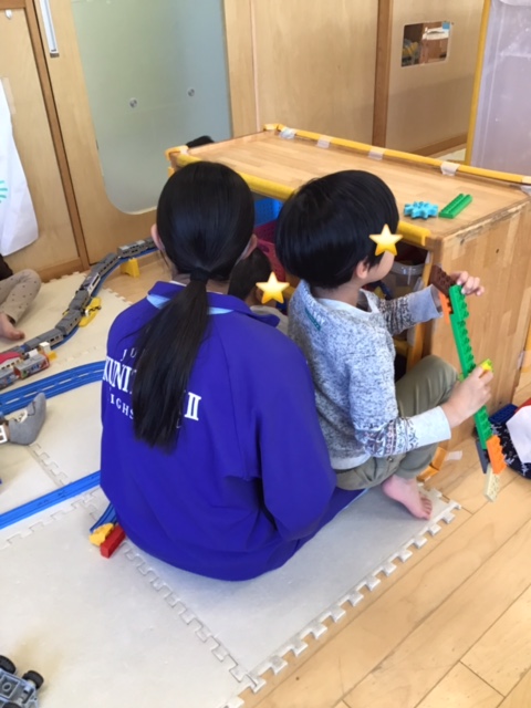 今週から職場体験で中学生のお姉さんが来てくれています。 一緒に遊ぶことが楽しみだった子ども達は「きょうはにじぐみとあそべるの?」「うれしい」と朝から嬉しそうな様子でした。 「ぶろっくであそぼう」「これつくれる?」と作った物を見せたりしながらお部屋でたくさん遊びました。