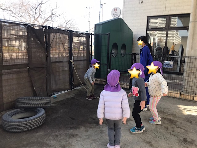 園庭では、縄跳びをしていました。何回跳べるかみんなで数えたり、たくさん跳べるところを見せていました。 「たのしかった!」と満足そうな子どもたちです。