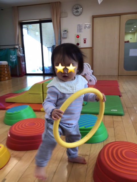 フラフープを転がしたり、中に入ったり、持ったりしながら色々な遊びを見つけていました。