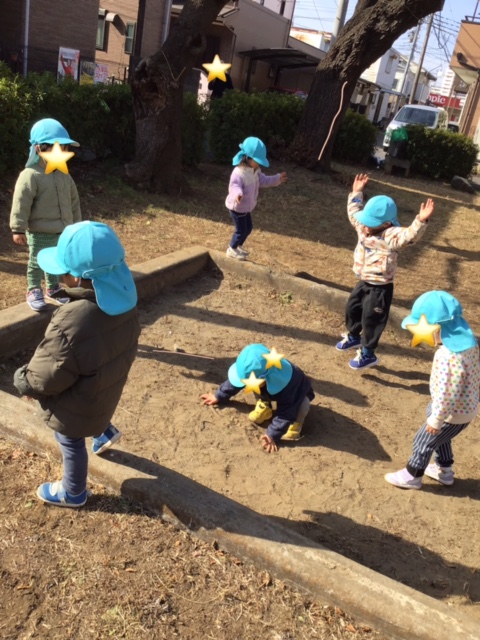 砂場の周りの縁を落ちないように歩いたり、砂場にジャンプしていました。