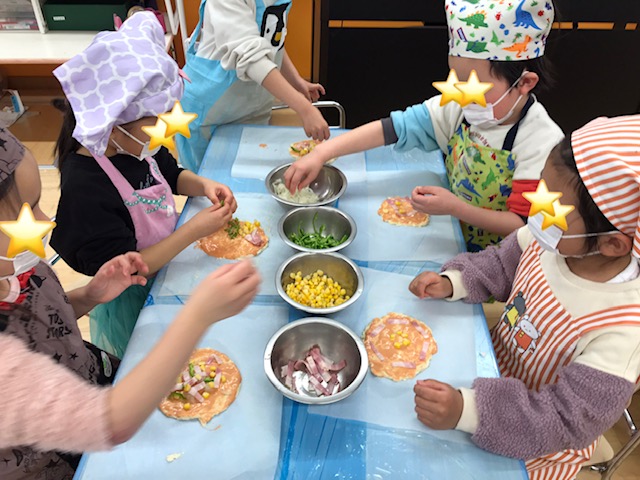 午後は、楽しみにしていたピザ作りがありました。生地から作りました。豆腐、小麦粉、砂糖、塩、ドライイーストを混ぜました。捏ねていくと、一つにまとまっていき生地が完成。ベタベタと手にくっつく感触が初めての感覚だったようで少し気持ち悪かったようですが、広げていくとピザの形になってきて「ピザだ!」と嬉しそうでした。最後はソースと具を自由にトッピングし、完成です。