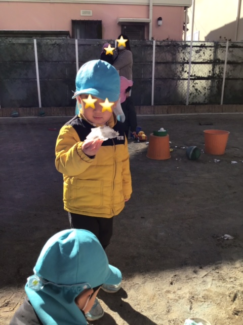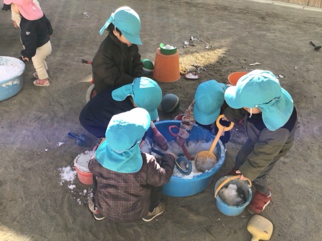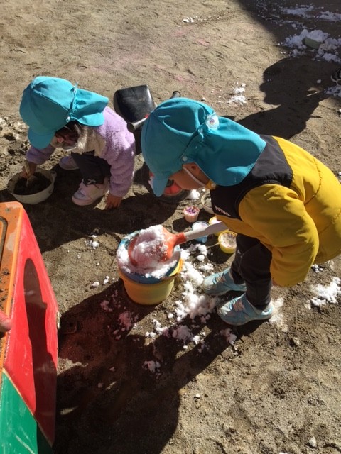 昨日降った雪が園庭にまだ残っていました。絵の具で作ったシロップを入れて混ぜたら、かき氷の出来上がり。