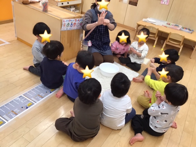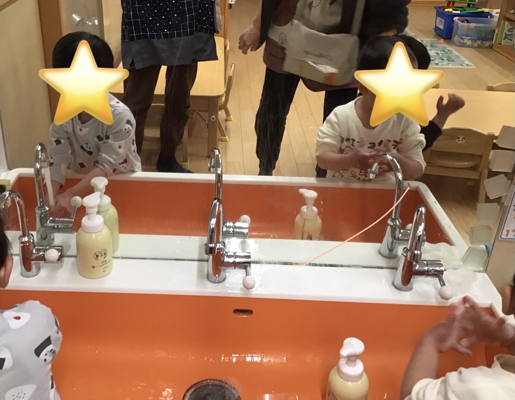 お部屋では手の洗い方をおさらい。 風邪予防のための咳エチケットもやってみました。