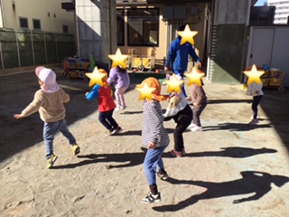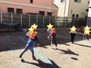 中当てでは、素早くボールを投げていました。「きゃー」と言いながら、逃げて楽しんでいました。