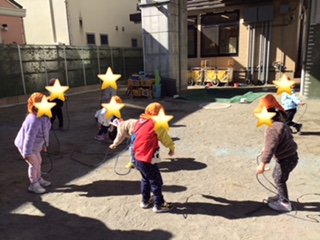 縄跳びの約束をみんなで確認してから始めました。 「人がどこにいるか確認!!」と元気に教えてくれました。 回してジャンプを繰り返していきました。