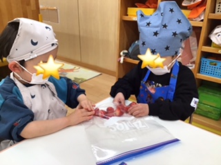 いちごジャム作りをしました。 いちごを袋にいれて、上から押していちご潰していきました。