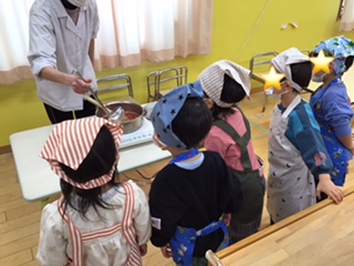 ぐつぐつお鍋で煮ている所をみて、興味深々。砂糖を入れてまぜるといい匂いがしてきました。「あまーいにおいだね」と言っていました。