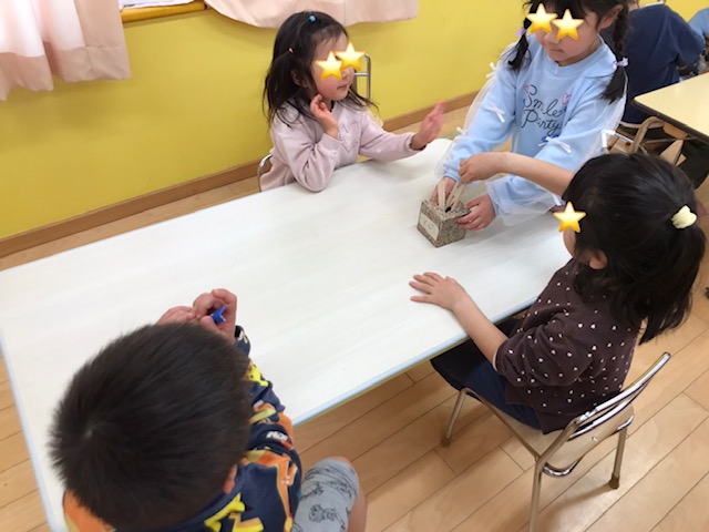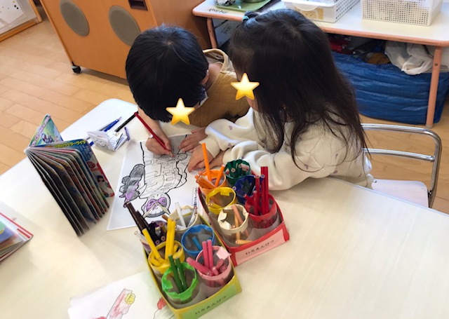 「なにしてるの?」「いっしょにぬろうか?」とお部屋遊びではお友達の遊びにも参加するなど楽しくお友達と過ごしています。