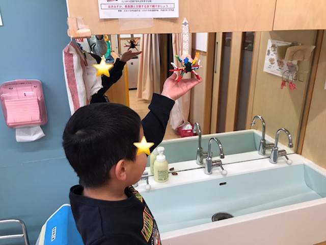 また、LaQで蜘蛛を作ると、壁に貼り付けて「ほんものみたい!」と蜘蛛がいそうな場所を探していました。鏡があるところでは2匹いるように見えることを発見し、お友達にも教えていました。