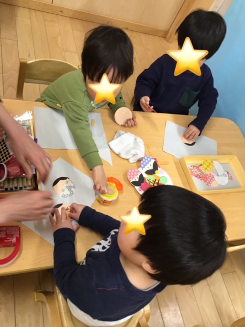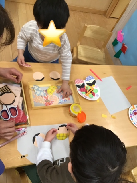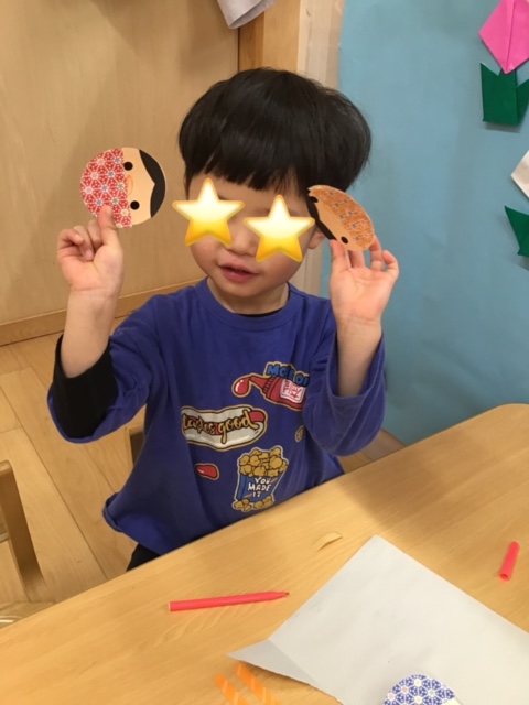 好きな柄の着物を選んでのりで貼ったり、目や口も貼ったり書いたりして可愛いおひなさまが出来ました!