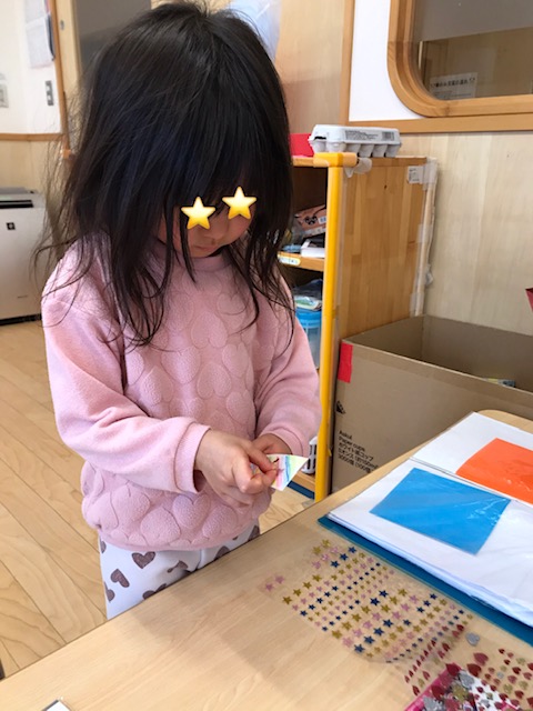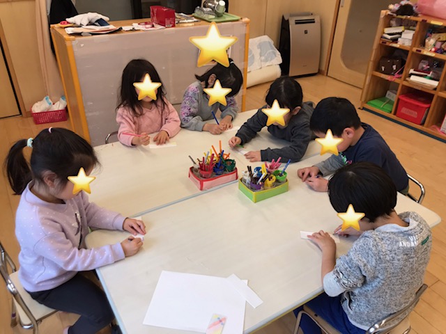3月にそら組さんのお別れ会があるので 子ども達からプレゼントを用意することに決めました。プレゼントは小学校でも使えるようにとしおりを作ることにしました。