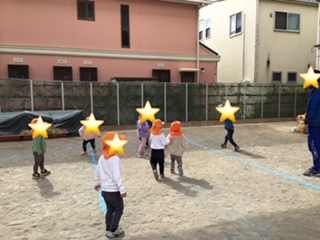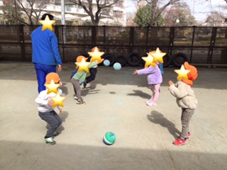 体育指導ではボール投げをしました。 向かいにいるお友達の手にむかってなげています。