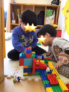 室内遊びでは、塗り絵やカードゲームをしたり、ブロックで家を作っていました。作った家でごっこ遊びをしていました。 「ピンホーン」「だれですか?」「おかあさんです」