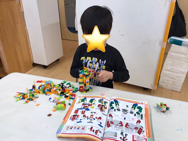 今日は朝から雨が降っていたので、子どもたちと話し合い、お部屋でたっぷりと遊ぶことにしました。「やったー!今日長い時間遊べる!」と大喜びの子どもたち。好きな遊びでじっくりと遊びました。昨日の続きがある子が多く、LaQでは難しいものも完成することができました。