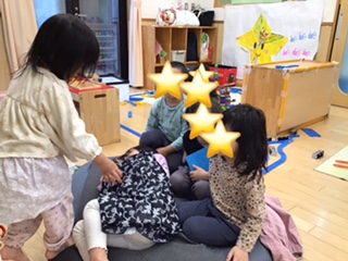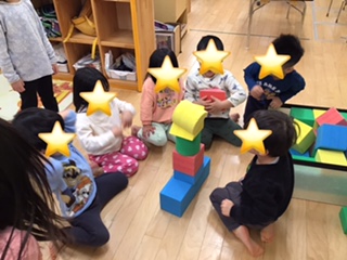 積み上げゲームをしました。 形の違うソフトブロックを順番に積み上げていきました。 どうやって積み上げていくか、考えながら、、ヒヤヒヤしながらも楽しんでいました。
