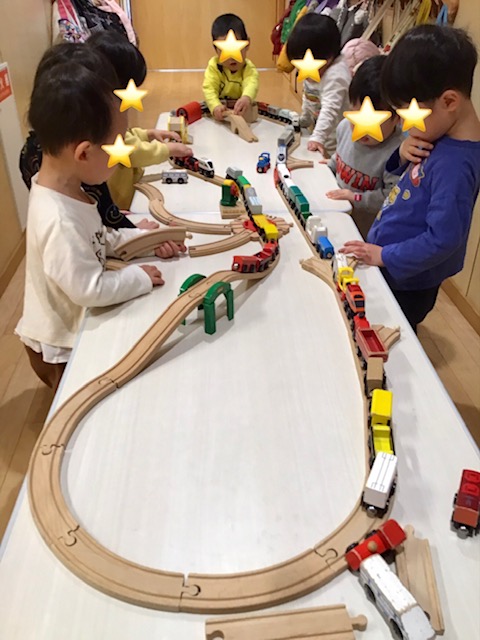廊下にテーブル出して、電車で遊びました。