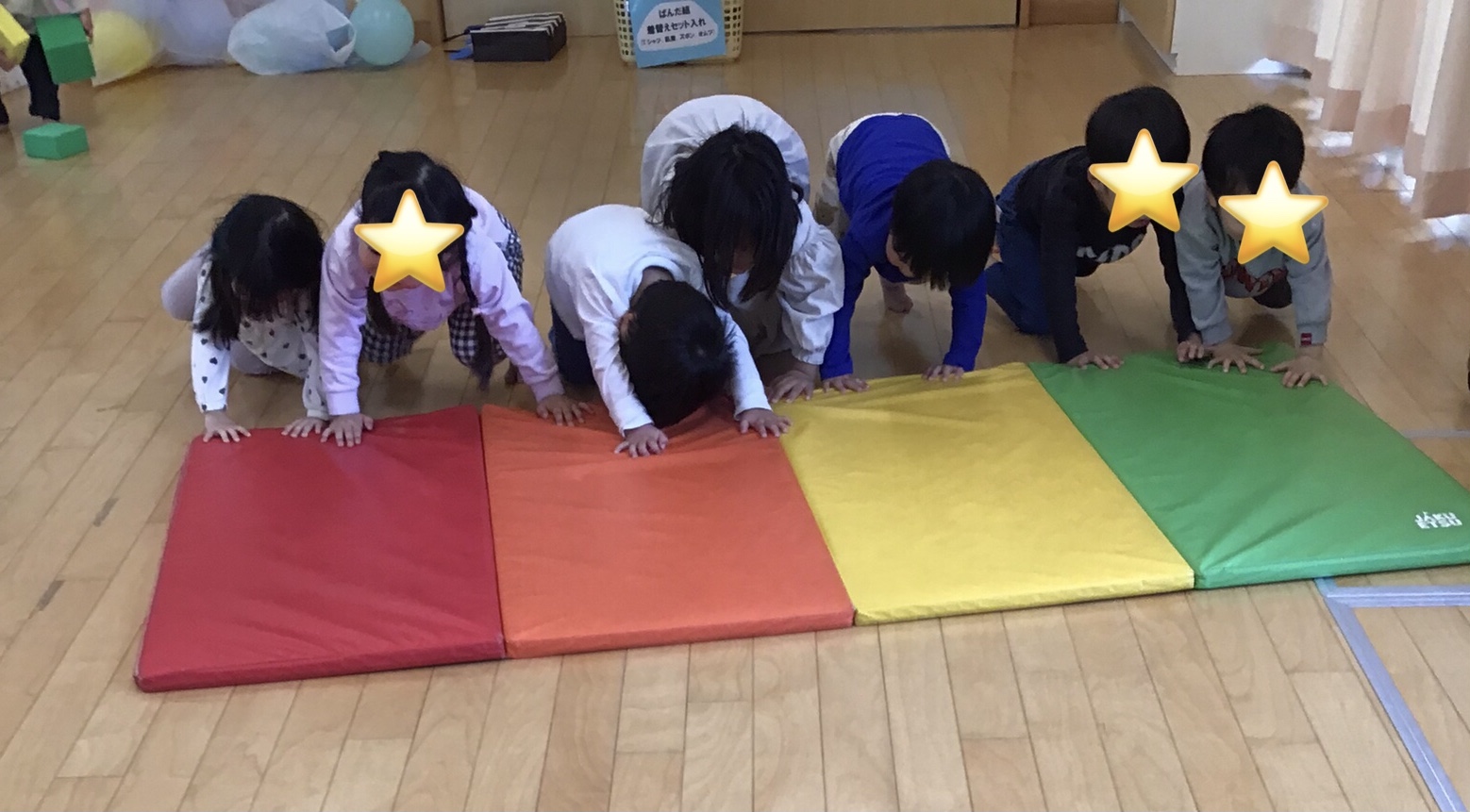 体をたくさん動かして汗をかいて楽しみました。また、ホールで遊ぼうね。
