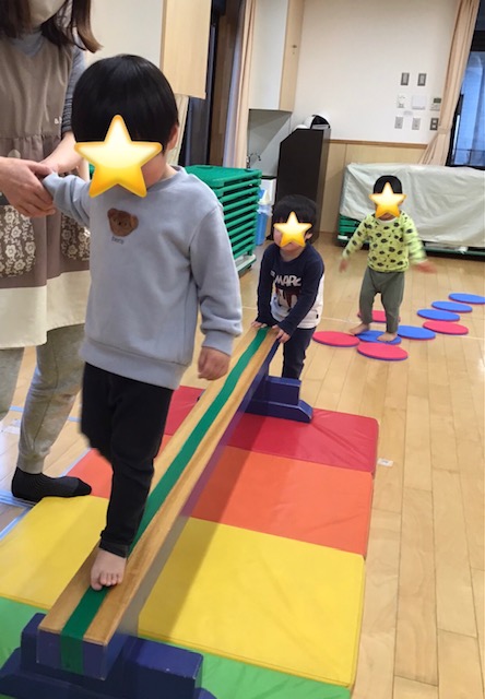平均台の一本橋歩きは、初めは緊張してましたが、慣れてくると両手を広げてバランスを取って歩いてました。