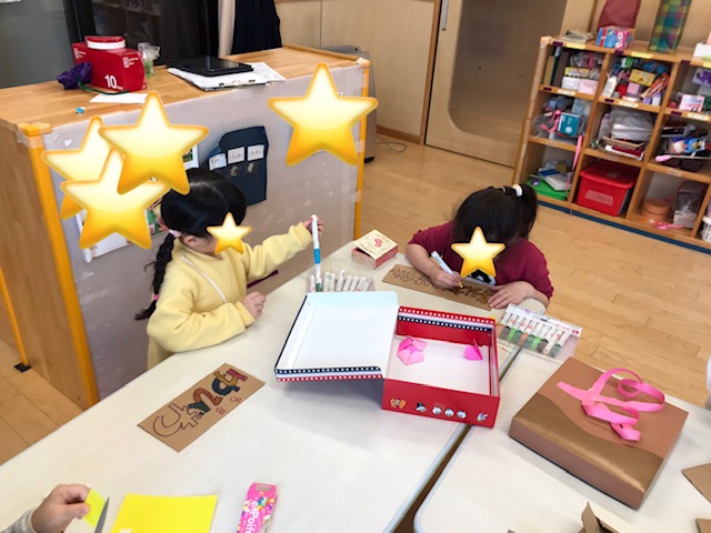 また、空き箱でランドセルを作り、学校ごっこも楽しんでいました。