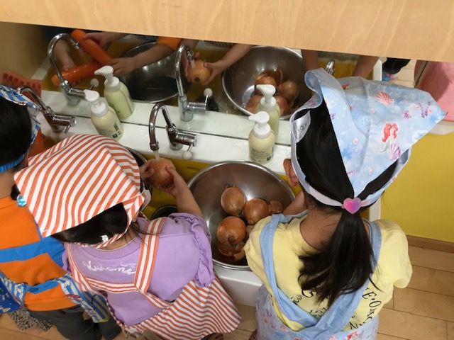 ほし組さんは野菜を洗い、皮を剥きました。