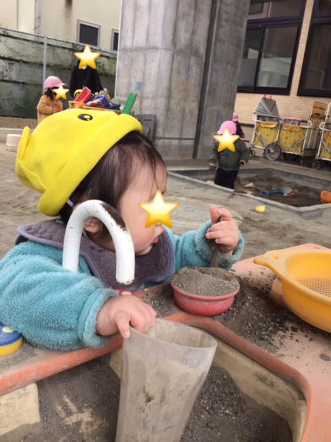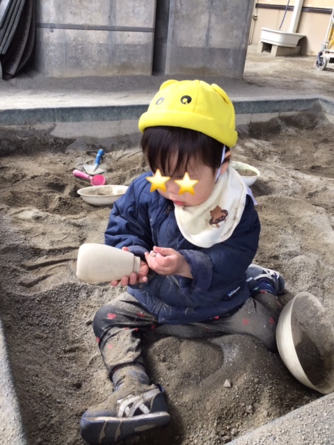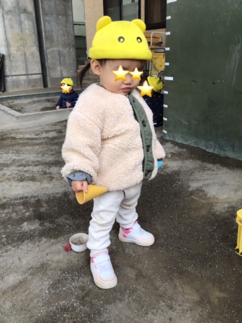 砂場の玩具を探していたりアイスクリームのコーンを2つ持っていました。