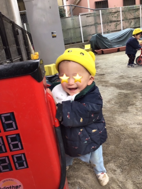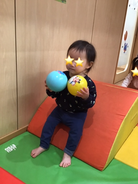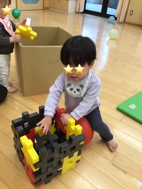ホールでは夢中になって大型ブロックで遊んでいました。