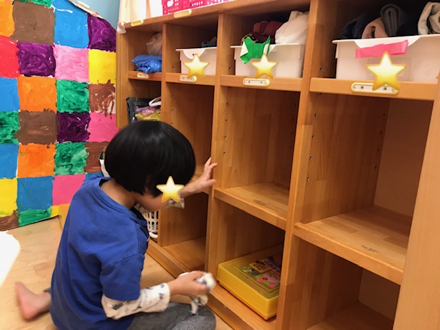 最後には雑巾でロッカーを拭きました。 角まで手を伸ばして拭いたり、汚れているところがないかチェックをしていました。 「これできれいにつかえるね」とピカピカになったロッカーをみて心地よさを感じたり、進級を楽しみにする姿がありました。