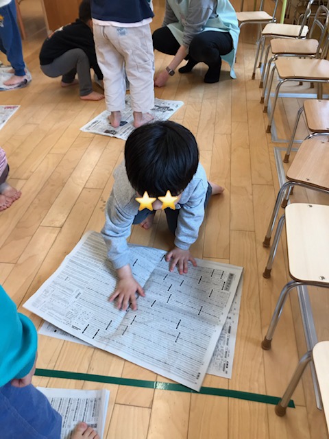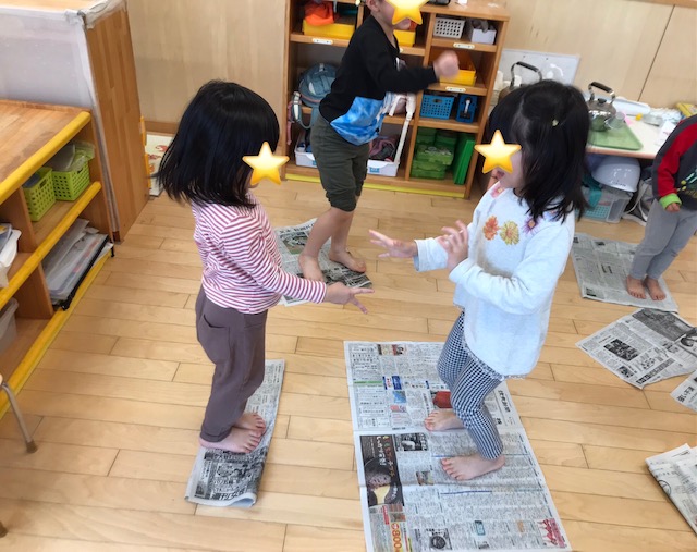 新聞紙島ゲームでは新聞紙の上に乗り、お友達とじゃんけんをして負けたら新聞紙を小さくしていくゲームです。