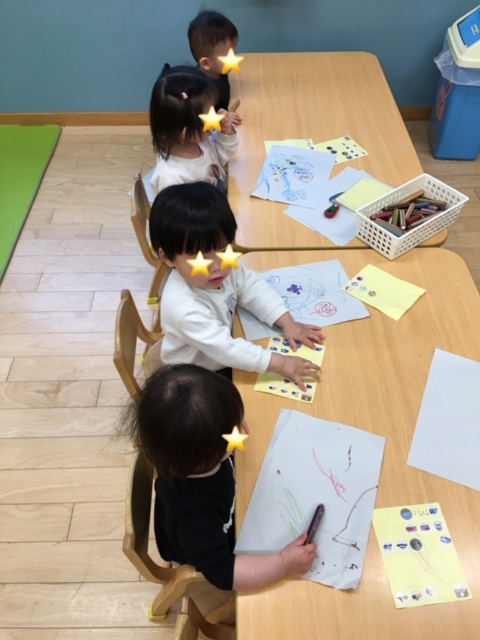 お部屋ではお絵描きやシール貼りもしました。 夢中になってお絵描きやシールを貼っていました。