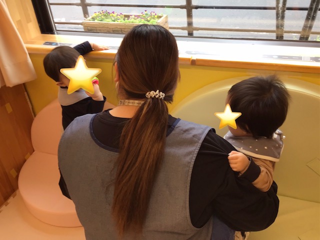 保育士の抱っこで窓の外を眺めたり、