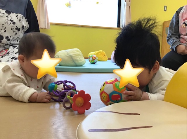 好きなおもちゃをみつけて、ぐっと手を伸ばして触ってみています。