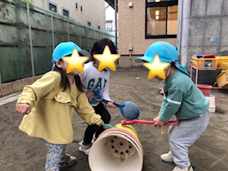 バケツを太鼓にして、トントンみんなで楽しそうです。