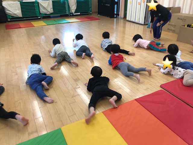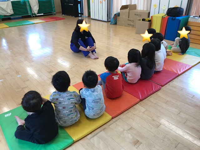 にじ組になって初めての体育指導がありました。 お話を聞く時は話す人の目を見て聞く事、お友達を押したり引っ張らない事、元気モリモリで頑張る事の3つのお約束をしました。 お山座りで上手にお話を聞いていました。