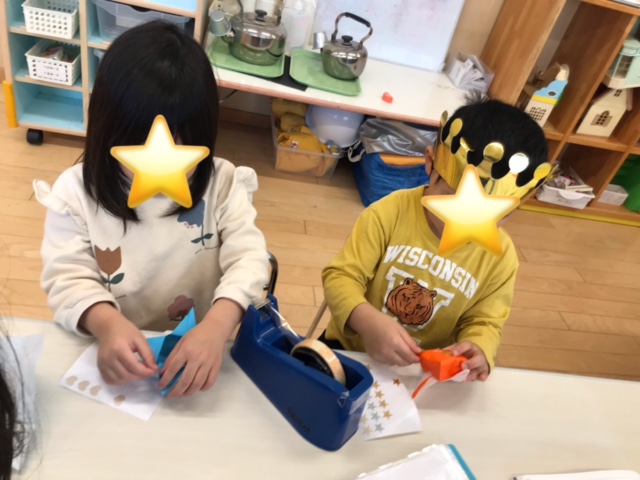 朝のお部屋遊びでは、保育者と一緒に折り紙でつのこう箱を作ったお友達。さくらの花びらを入れるそうで、シールも貼って可愛くしていました。