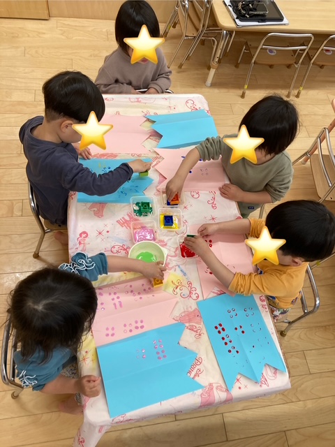 同じ色をスタンプする子や混ぜて楽しんだりしていました。