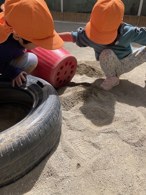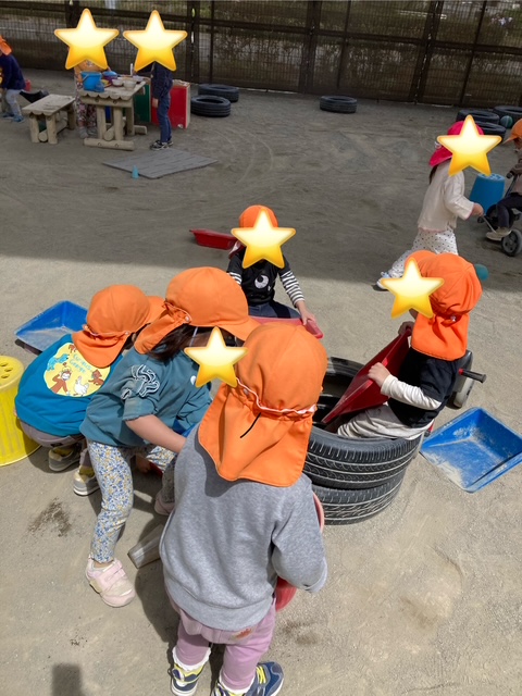 園庭遊びではいつの間にかお友達同士で協力して、カラーバケツに砂をいれる遊びをしていました。