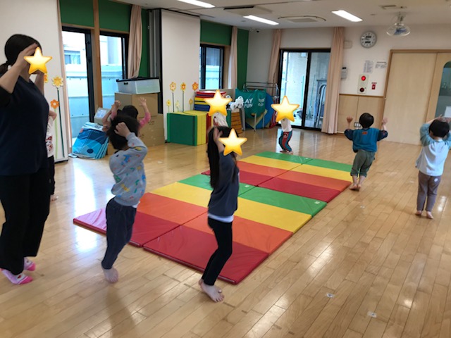 色々な体の使い方をして、マットからマットへと移動したり、マットの周りをうさぎジャンプやグーパーチョキジャンプでお散歩しました。