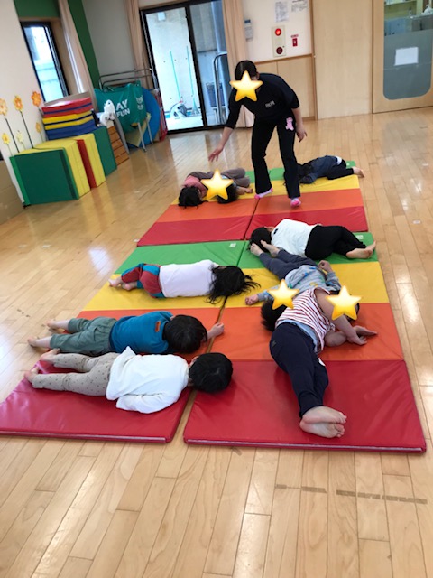 そして先生の合図で急いでマットに座ったり、気を付けで立ったり、おやすみなさいで寝たりしました。