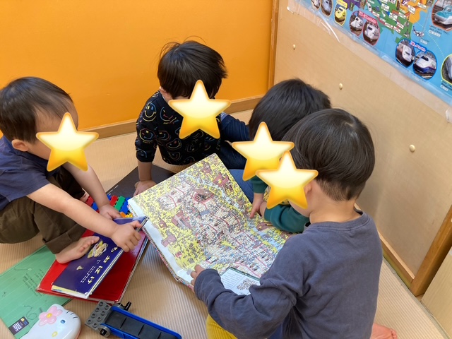 お部屋ではお友達と数人でウォーリーを探せを楽しんでいました。