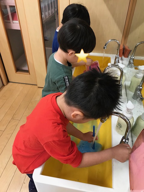「わぁ〜こんなになっちゃった〜」と色水遊びを楽しみながら綺麗に洗ってくれました。