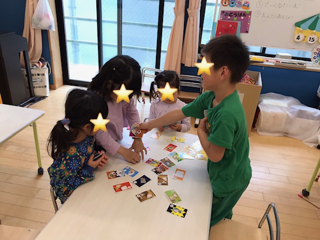 自由遊びではお友達と会話を楽しみながら日々楽しく遊んでいます。かるたをして遊んでいました。 子ども達だけで遊びを進めるようになっています。