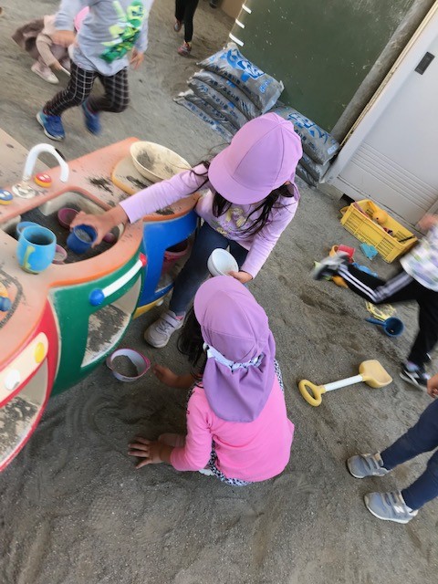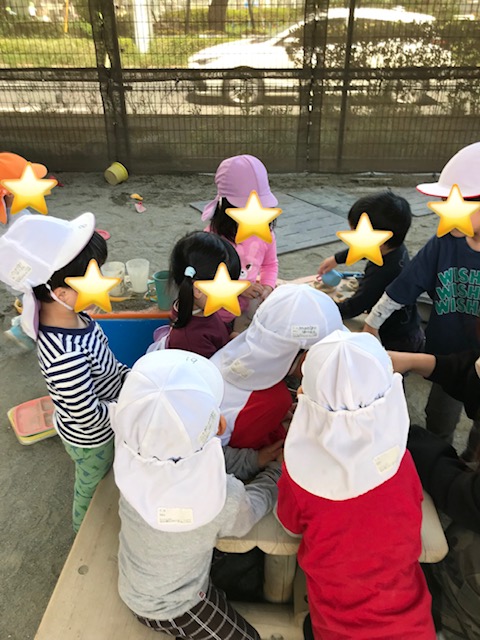 お友達のお誕生会がありました。 「〇〇ちゃんにケーキ作ってあげよう!」 「そうだね、お砂糖入れて甘くしよう!」と お砂でケーキ作りが始まっていました。