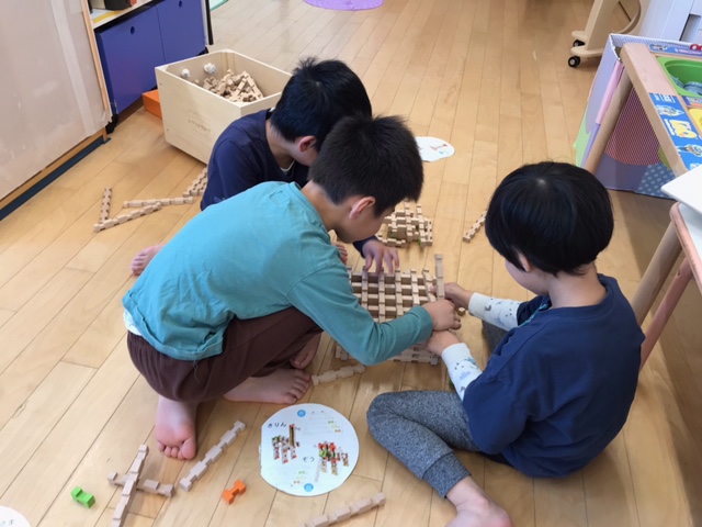 木のブロックを「これこうじゃない?」「こっちのがいいよ!」と3人で相談しながら作っていました。