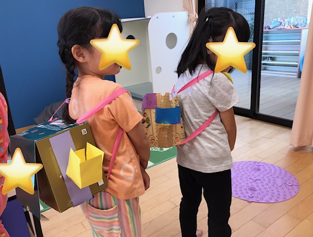 制作をしている子たちは、前から作っていたランドセルを完成させて、ウキウキでごっこ遊びをしていました。