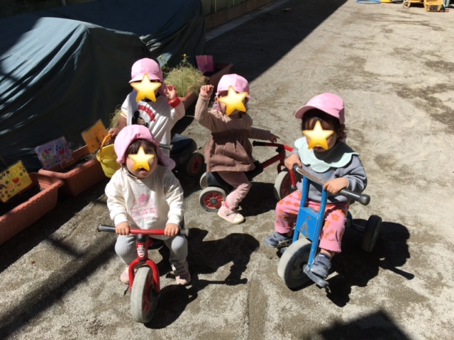 みんなでミニバイクや三輪車に乗ってカメラ目線で見てくれました。