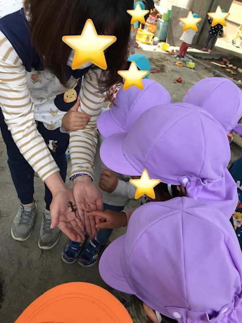 保育者が手に乗せると恐る恐るそっと触ってみたり、「可愛い」と近くで見ていました。