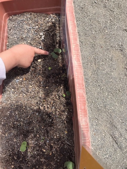 先日植えたオシロイバナの種を毎日観察するそら組の子ども達。 少しずつ芽が出てきて、「あ!きょうはこっちからでてる!」とお友達と生長を喜んでいました。