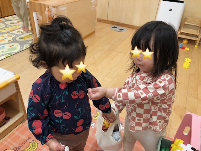 お部屋ではごっこ遊びを友達と楽しんでいました。「はい、どうぞー」。バッグの中はいつもいっぱい入ってます。